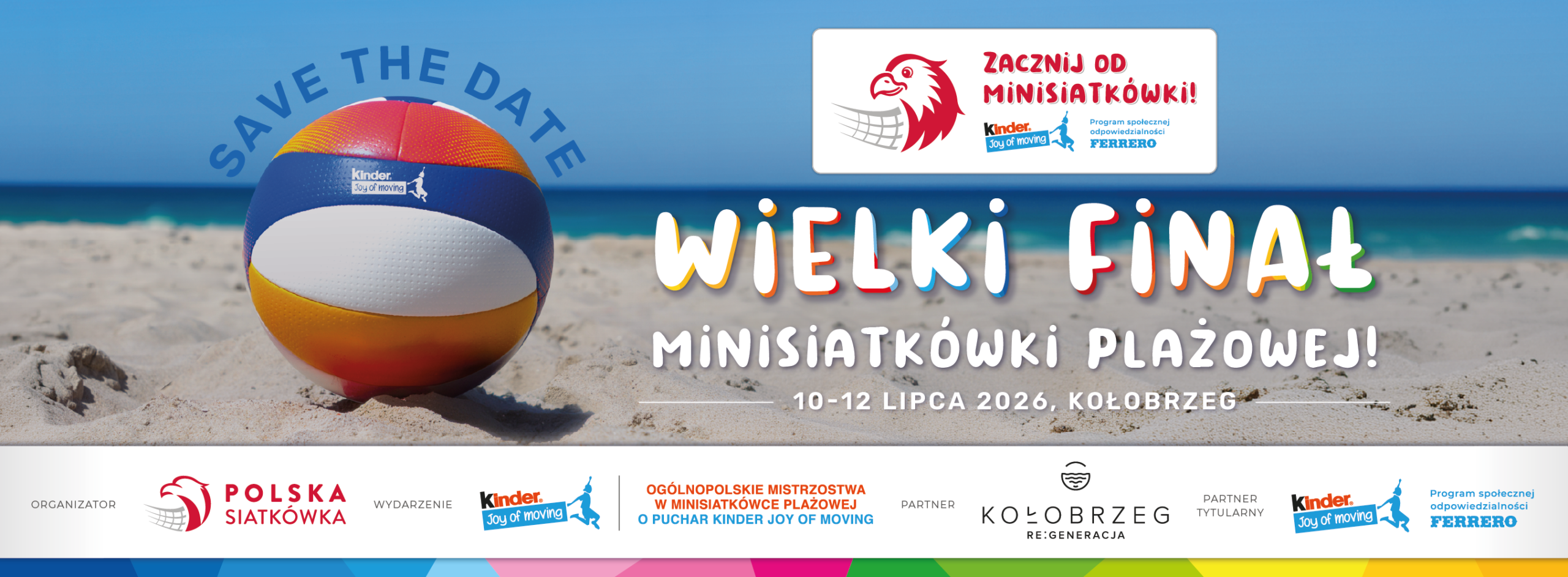 Z ogromną przyjemnością pragniemy poinformować, że 4. Wielki Finał Ogólnopolskich Mistrzostw w Minisiatkówce Plażowej o Puchar KINDER Joy of moving zostanie rozegrany 10-12 lipca 2026 roku w Kołobrzegu. Turniej zostanie rozegrany pod honorowym patronem Ministerstwa Sportu i Turystyki oraz Polskiego Komitetu Olimpijskiego.